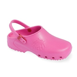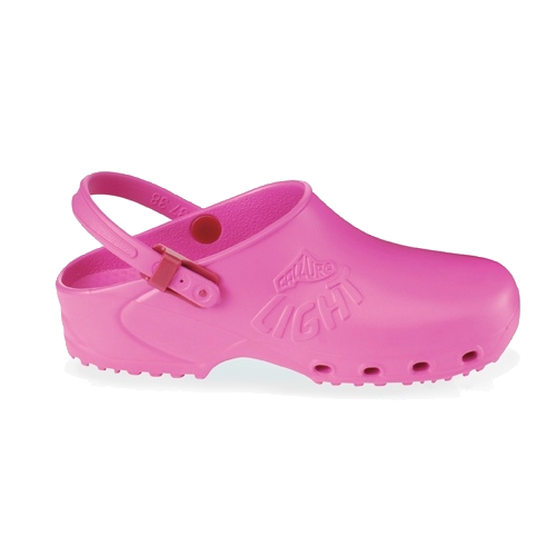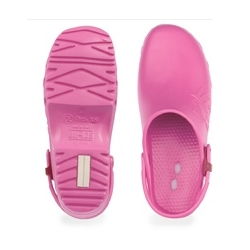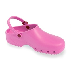 Zoccoli professionali in morbido materiale plastico extraleggero, suola antiscivolo certificata EN ISO 20347:2008, con tassello antistatico, certificati CE, con fori laterali per la traspirazione del piede, disponibili solo senza fori sulla tomaia e con cinturino posteriore applicato.